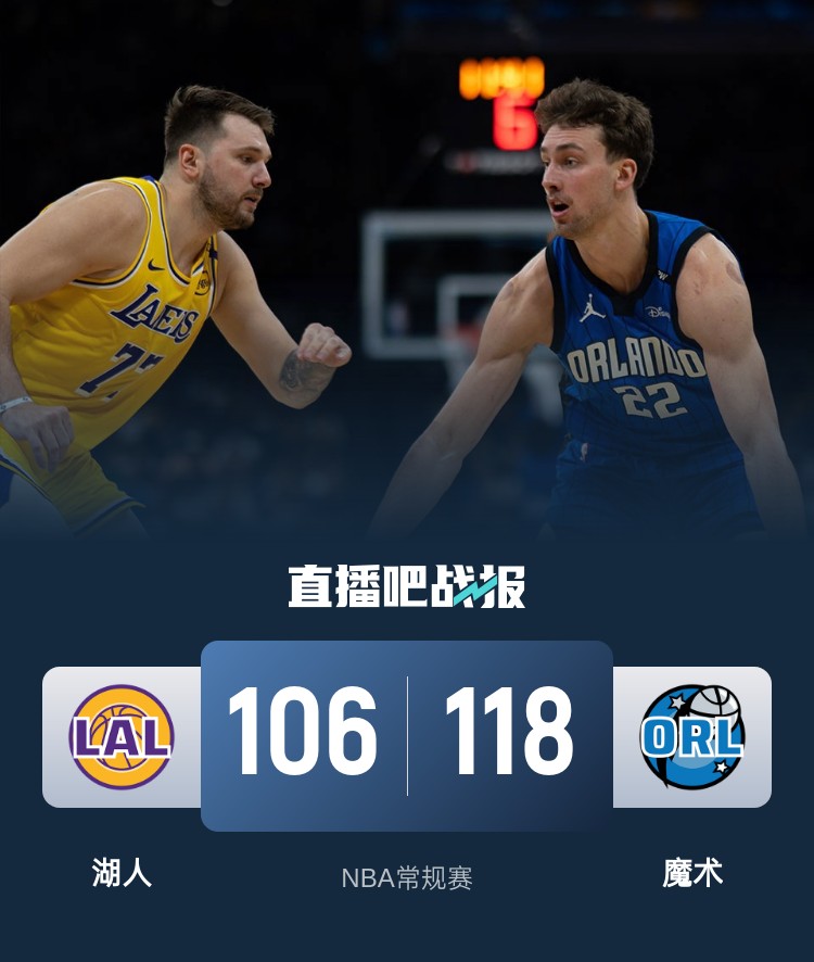 比赛开始,湖人反客为主打出10-5的开局,魔术内外开花迅速反超比分,东契奇连得11分,双方陷入缠斗,比分始终紧咬,湖人不断冲击篮筐连投带罚拿分,班凯罗高效输出带队咬住,半场战罢湖人60-58领先魔术。易边再战,湖人攻防两端表现不佳,魔术外线开火连中三分一举获得两位数优势,东契奇连中三分止血,末节魔术占得先机一度获得17分优势,东契奇和詹姆斯联手带队轰出10-0的攻击波延续希望,小瓦格纳挺身而出内外开花连得7分,湖人苦苦追赶无果。最终,湖人106-118不敌魔术,遭遇3连败。