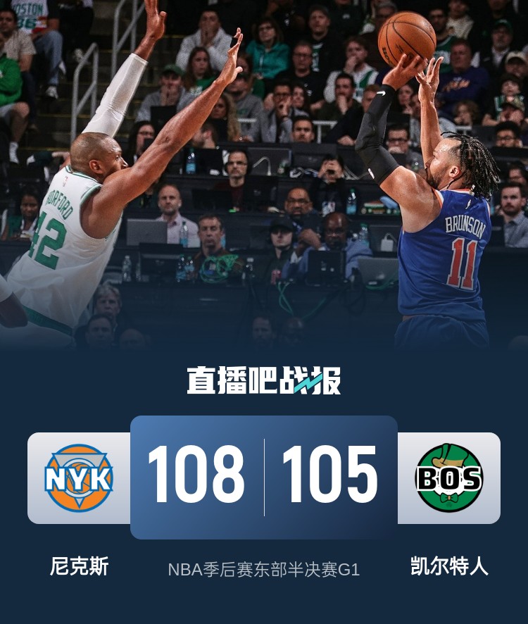 比赛开始,双方开场势均力敌,比分交替领先,塔图姆高效输出,尼克斯三分3连击强势回应,次节凯尔特人针对米切尔-罗宾逊祭出“砍人战术”,尼克斯节奏被打乱,唐斯也收到犯规困扰,杰伦-布朗连续拿分率队取得两位数领先,半场战罢凯尔特人61-45领先尼克斯16分。易边再战,凯尔特人稳扎稳打将优势扩大到20分,尼克斯一波9-0止血,哈特攻防两端立功,末节尼克斯延续火力反超比分,双方争夺陷入白热化,比分交替领先,关键时刻双方各自错失绝杀,比赛进入加时。加时赛,尼克斯持续发力占据主动,凯尔特人苦苦追赶,布里奇斯抢断杀死比赛,最终,尼克斯加时108-105逆转凯尔特人。