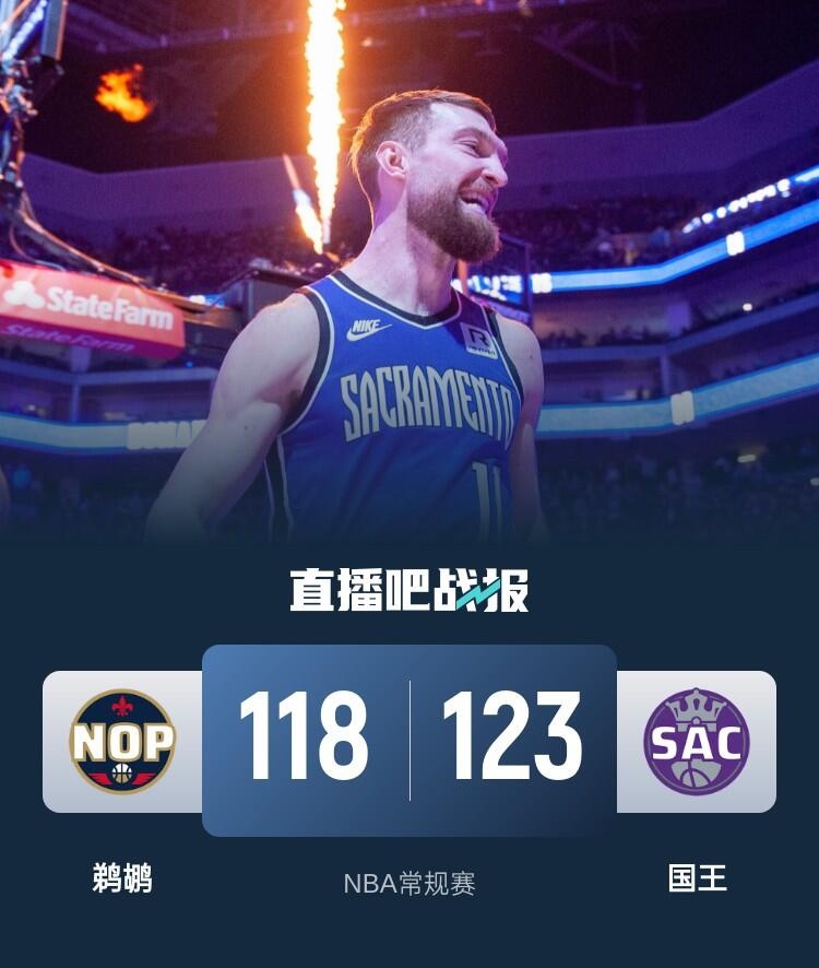 首节之争鹈鹕反客为主打出完美开局,墨菲和麦科勒姆连续外线命中三分,鹈鹕命中6记三美分送上29-9的攻势早早确立起20分的领先;国王最后时刻及时苏醒,在前9分钟仅得9分的情况下最后3分钟里拿到15分止住颓势;次节开局鹈鹕发动第二波攻势送上海13-2的攻势再度拉开比分;国王又是后程发力依靠进攻端回暖蚕食比分,不过鹈鹕一直稳定输出并带着11分领先进入下半场。休息归来国王先是一波10-0缩小分差,随后彻底暴走送上23-7的攻势直接反超比分,第三节国王爆砍45分并净胜23分,同时在第四节初送上6-0的攻势,疯狂的攻势帮助他们从最多落后20分的情况下到第四节反超18分;不过之后接近4分钟里国王哑火给了鹈鹕机会,后者送上14-0并在读秒阶段追至2分,不过国王最后稳定罚球守住胜利。最终,国王20分逆转鹈鹕,并送鹈鹕8连败。
