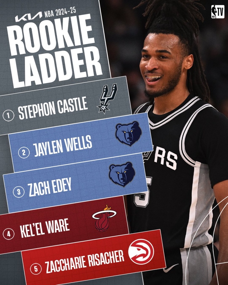 3月6日讯 NBA官方公布了最新一期的新秀榜,马刺4号秀卡斯尔继续领跑。详情如下: