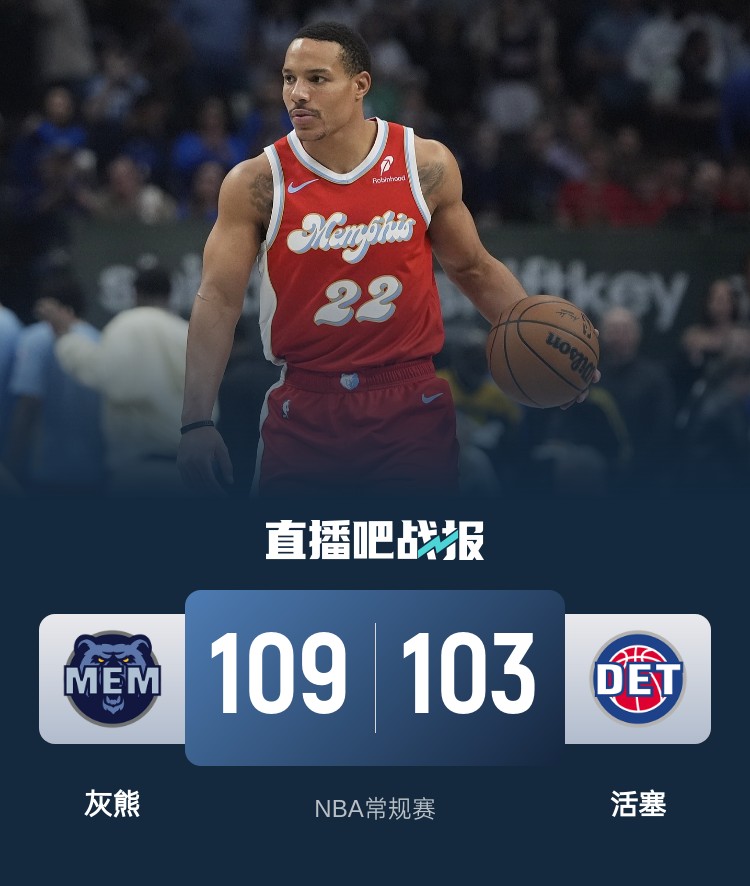 一开场,灰熊率先发力打出12-4的开局,活塞内外开花迅速追赶,次节双方陷入僵持,灰熊内外开花打破得分荒,此后却突然哑火,活塞多点开花轰出21-6的进攻高潮强势反超,小皮蓬三分止血,半场战罢活塞47-46领先灰熊1分。下半场,贝恩延续火力带队重新占据场上主动,活塞加强防守利用反击再度反超,末节双方继续缠斗,关键时刻贝恩内外开花连得7分确立优势,康宁汉姆出现关键失误,活塞苦苦追赶无果。最终,灰熊109-103力克活塞,客场过关。