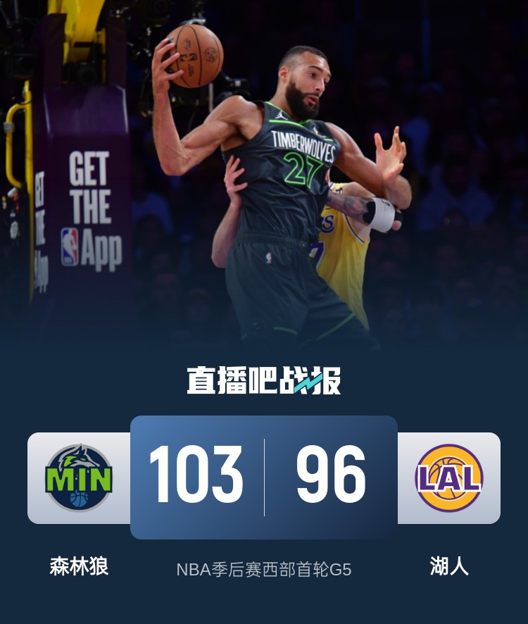 比赛开始,使用小阵容首发的湖人对戈贝尔办法不多,后者肆虐内线高效输出,东契奇手感不佳,但连续造成杀伤罚球拿分,森林狼外线开火连中三分占据场上主动,次节詹姆斯连续拿分带队追赶,森林狼积极拼抢前场篮板二次进攻保持优势,戈贝尔和迪文岑佐先后内线得手,半场战罢湖人49-59落后森林狼。易边再战,詹姆斯连中两球,森林狼继续冲击内线保持领先,东契奇得分助攻一肩挑,湖人连中三分终于反超,戈贝尔补篮稳住局势,末节双方争夺陷入白热化,芬尼-史密斯和麦克丹尼尔斯先后6犯离场,兰德尔强攻得手,湖人连中三分顽强咬住,但康利飙中关键三分,兰德尔也两罚都有。湖人大势已去无力回天。最终,湖人96-103不敌森林狼,总比分1-4被对手淘汰出局。