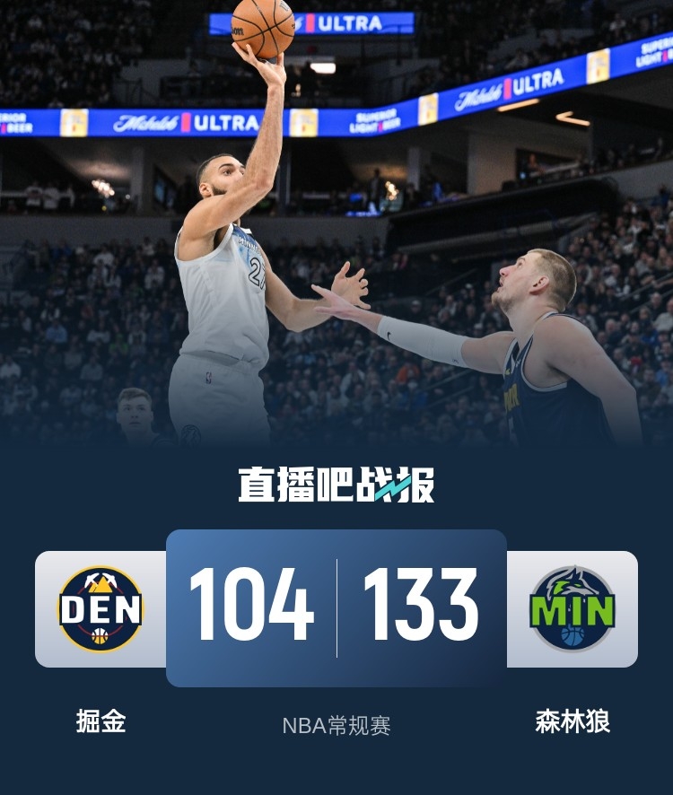 比赛开始,戈贝尔上来很是兴奋,进攻端连续强打加送妙传带队建立主动权,随后约基奇里突外投单节13分带队止血,但森林狼多点开花首节轰下40分领先9分,次节小乔丹接连前场篮板,穆雷和威少联手追分,森林狼还是能多人回应半场领先双位数。下半场,掘金防守端依然提不起劲儿,爱德华兹里突外投单节轰下16分,森林狼继续多点开花领先到20分以上,末节掘金进攻端断电,打了5分钟仅得2分,森林狼牢牢保持住20分以上领先,最终森林狼133-104大胜掘金,终结对手4连胜。
