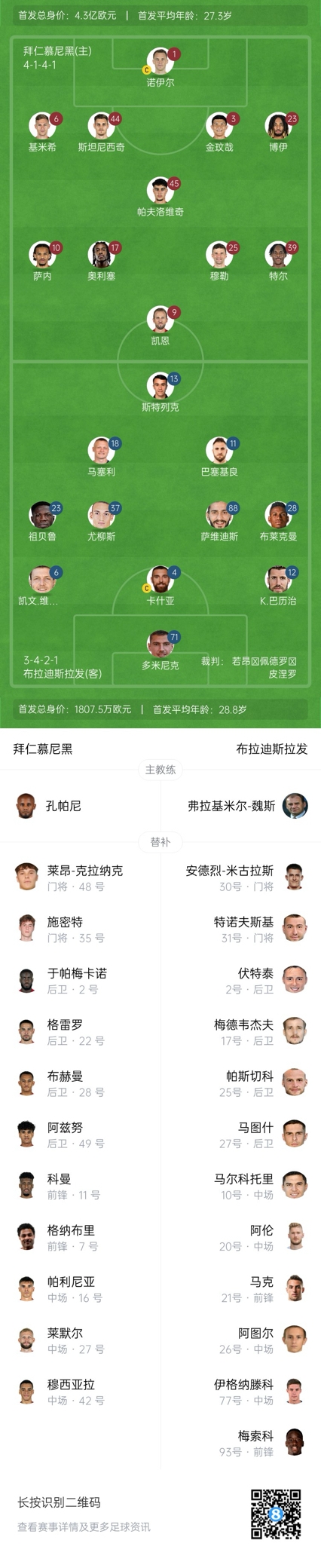 拜仁替补:35-施密特、48-卡拉尼克、2-于帕梅卡诺、7-格纳布里、11-科曼、16-帕利尼亚、22-格雷罗、27-莱默尔、28-鲍曼、42-穆西亚拉、49-阿兹努