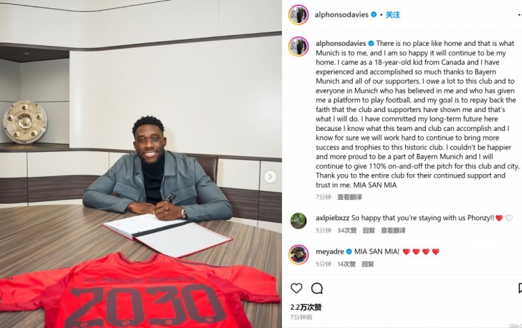 2月5日讯 拜仁已经官宣续约戴维斯至2030年,后者也通过社媒晒出签约照纪念。