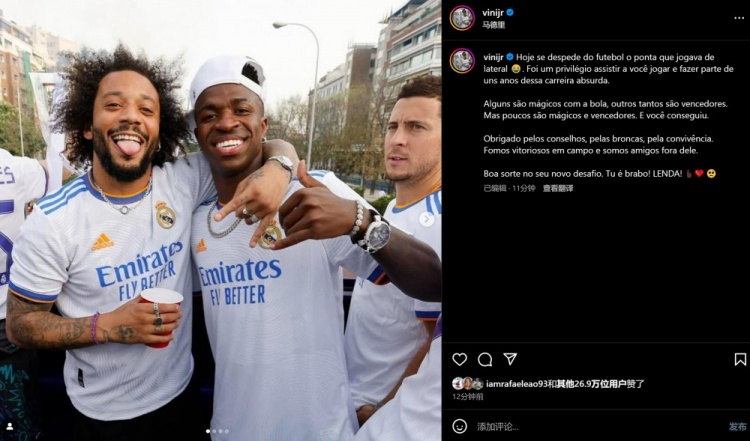 2月6日讯 36岁的马塞洛宣布挂靴退役,他在皇马和巴西的前队友维尼修斯也送上了祝福。
