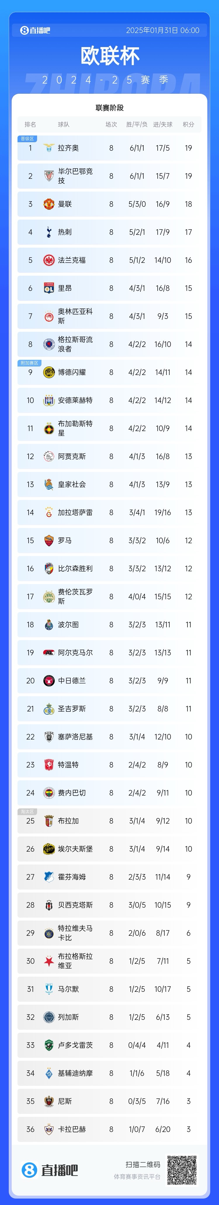 1月31日讯 欧联杯联赛阶段收官,最新积分榜情况出炉!