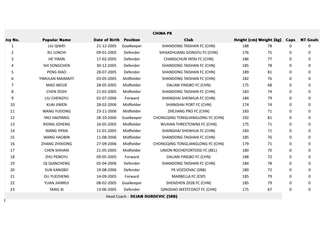 后卫:2-徐俊驰(石家庄功夫)、3-贺一然(长春亚泰)、4-史松宸(山东泰山)、5-彭啸(山东泰山)、19-齐千程(山东泰山)、20-孙康博(塞尔维亚沃日多瓦茨)、23-杨希(青岛西海岸)