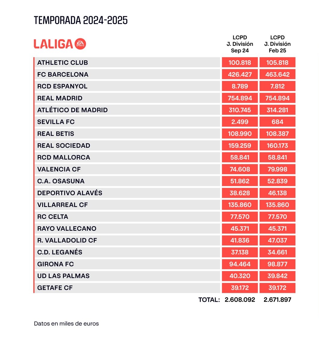 2月19日讯 西甲官方在冬窗后更新了更新的各队工资帽,皇马7.55亿欧居首,巴萨4.64亿欧第二。