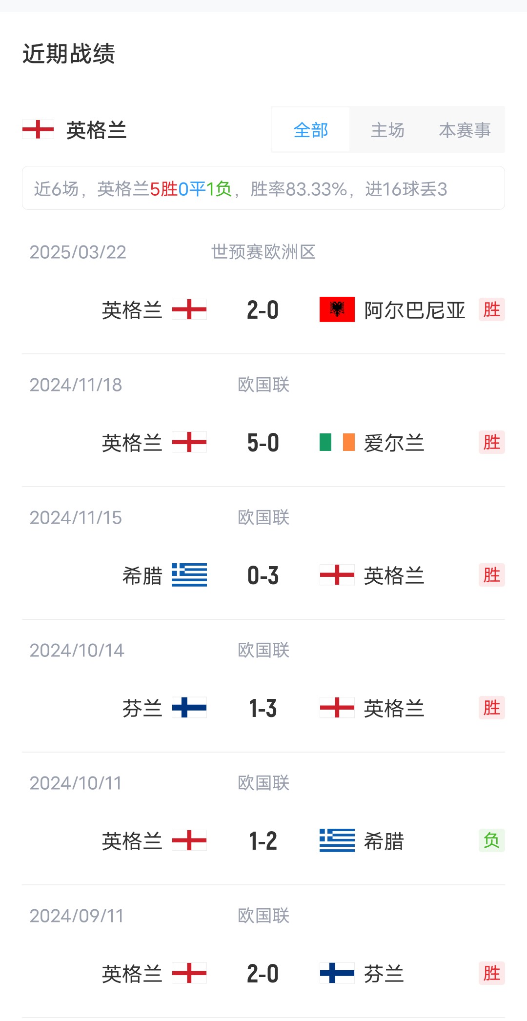 上轮比赛英格兰客场2-0击败阿尔巴尼亚,拉脱维亚客场1-0小胜安道尔。目前两队实力差距明显,在最新的FIFA排名中,英格兰排在第4,而拉脱维亚排在140。