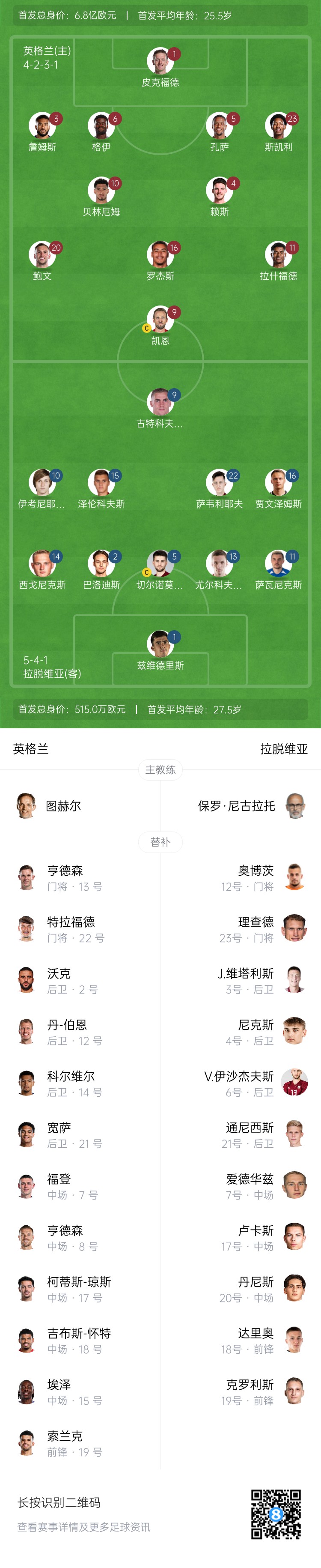 英格兰首发:1-皮克福德、3-詹姆斯、6-格伊、5-孔萨、23-刘易斯-斯凯利、4-赖斯、10-贝林厄姆、20-鲍文、16-罗杰斯、11-拉什福德、9-凯恩