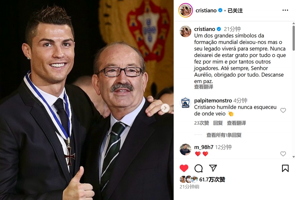 C罗在社媒发布了两人的合照,并写道:世界足坛的伟大象征之一离开了我们,但他的遗产将永存。我永远感激您为我和其他众多球员所做的一切。永别了,奥雷利奥先生,感谢您的一切。安息吧。