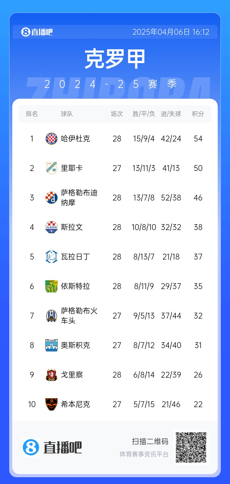 此役过后萨格勒布迪纳摩已经落后榜首球队哈伊杜克8分,争冠希望渺茫。