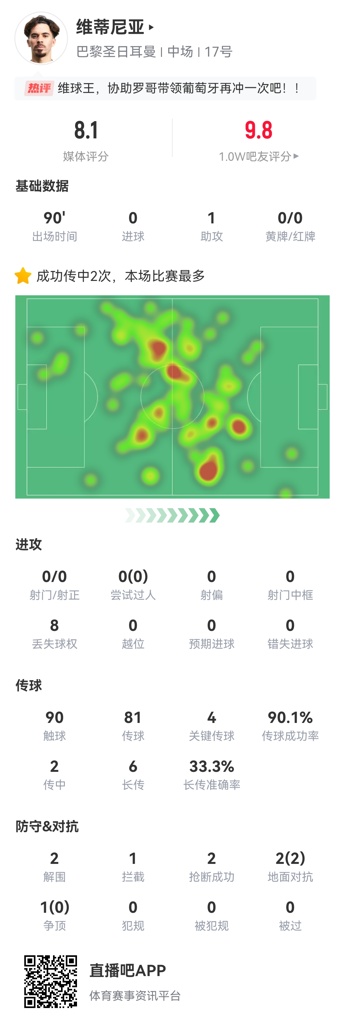 而在凌晨的决赛中,维蒂尼亚送出1次助攻,并有4次关键传球,获得了全队并列第二高的8.1评分。