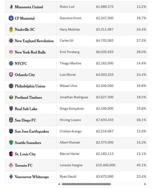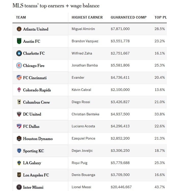 6月26日讯 The Athletic统计了美职联各队薪资最高的球员,梅西超2000万美元居首,因西涅1540万美元。