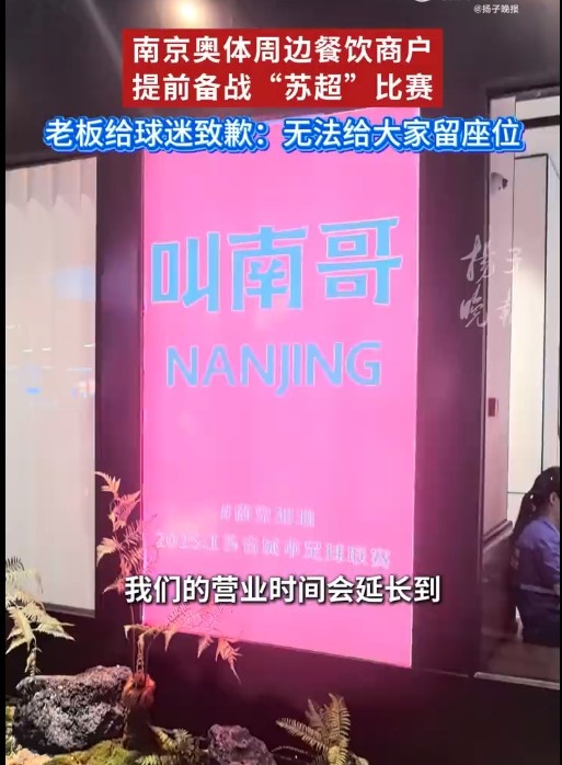 在一家餐饮店,扬子晚报记者看到了“叫南哥”应援海报。谈到即将到来的比赛,该店老板朱先生向记者表示:“我们非常期待这场比赛。考虑到客流增加,当天会加大备货量并增派服务人员,还将推出‘苏超’球迷专属套餐。朱先生虽然是宿迁人,但他直言更希望南京队获胜。“营业时间将延长至比赛结束,待所有观众离场后我们才休息。每个岗位都增加了一名员工,从原来的15人增至20人,全力做好‘苏超’球迷的接待工作。”