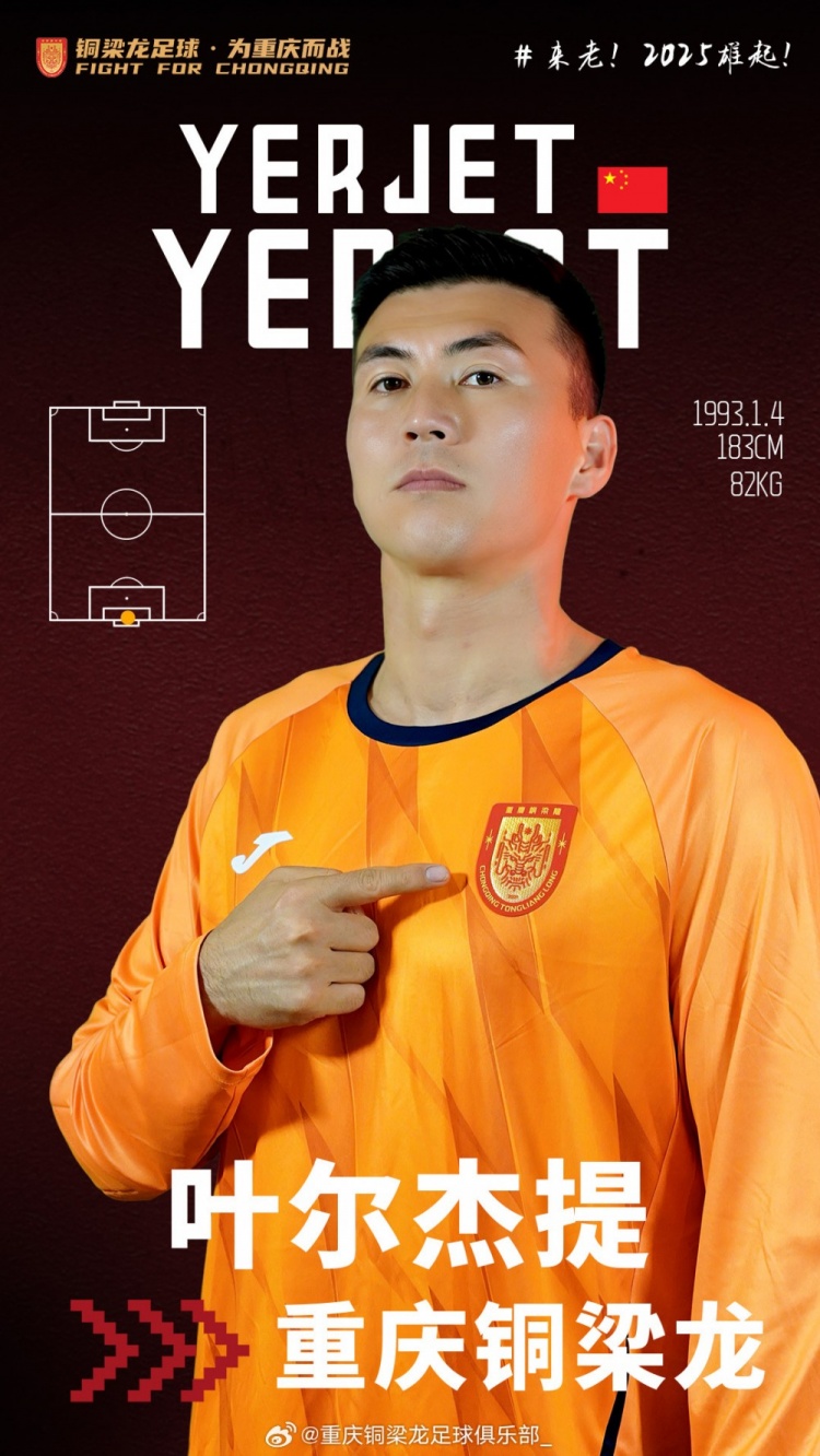 1月15日讯 重庆铜梁龙俱乐部官方宣布,门将叶尔杰提加盟球队。