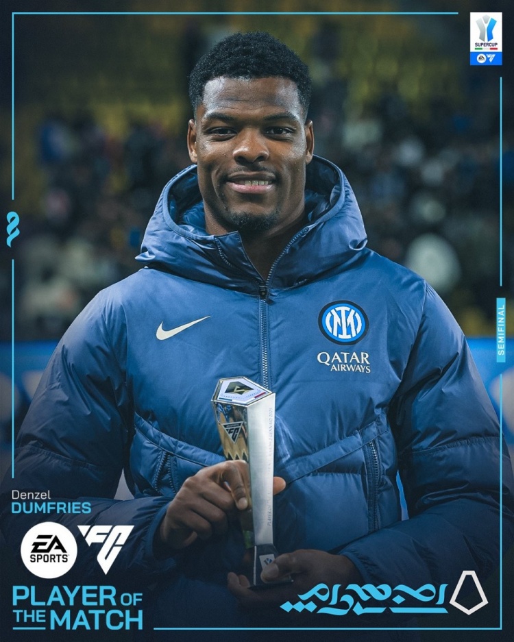 1月3日讯 意超杯半决赛,邓弗里斯倒钩+世界波,国米2-0击败亚特兰大。邓弗里斯出席新闻发布会。